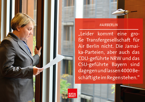 Leider kommt eine umfassende Transfergesellschaft für Air Berlin nicht. Nachdem der Bund mit einem Überbrückungskredit geholfen hat, ist diese Haltung schäbig gegenüber den Arbeitnehmerinnen und Arbeitnehmern und deren Familien – die Jamaika-Parteien, aber auch das CDU-geführte NRW und das CSU-geführte Bayern sind gegen eine Transfergesellschaft. Das ist ein Schlag in die Magengrube der Beschäftigten. Ein Lichtblick am Horizont ist allerdings, dass zumindest das SPD-geführte Land Berlin weiterhin alles versucht, den Betroffenen tatkräftig zu helfen, damit diese am Ende des Tages nicht im Regen stehen.