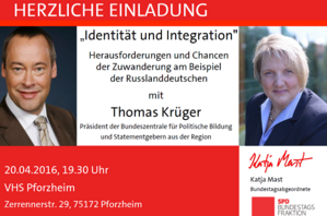 Am Mittwoch, 20.4., 19.30 Uhr ist Thomas Krüger, Präsident der Bundeszentrale für politische Bildung, auf Einladung der SPD-Bundestagsabgeordneten Katja Mast zu Gast in Pforzheim. Er spricht in der VHS Pforzheim zum Thema „Identität und Integration – Herausforderungen und Chancen der Zuwanderung am Beispiel der Russlanddeutschen“. Alle Bürgerinnen und Bürger sind herzlich eingeladen zu kommen.
