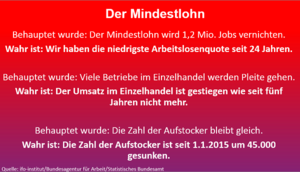 Der Mindestlohn gilt seit sechs Monaten – und die Lohnuntergrenze von 8,50 Euro wirkt: Das Hoch auf dem Arbeitsmarkt hält weiter an. Der Umsatz im Einzelhandel ist gestiegen wie seit fünf Jahren nicht mehr. Und die Zahl der Aufstocker ist seit Inkrafttreten des Mindestlohns um 45.000 gesunken.