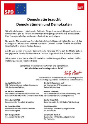 Auf Initiative von Katja Mast haben sich führende Sozialdemokratinnen und Sozialdemokraten aus Bund und Land zum 11. Mai in Pforzheim geäußert. Unter ihnen Partei- und Fraktionschefin Andrea Nahles, SPD-Spitzenkandidatin zur Europawahl und Bundesjustizministerin Katarina Barley und Landes- und Landtagsfraktionschef Andreas Stoch. „Das ist eine tolle Unterstützung und Rückendeckung. Das ist gelebte sozialdemokratische Solidarität", so Mast.
