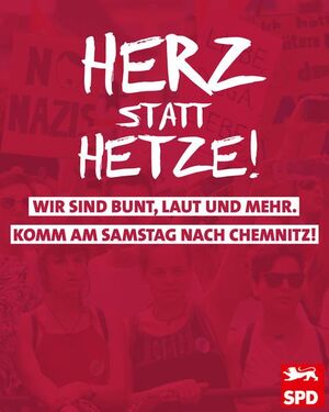 Die baden-württembergischen SPD-Abgeordneten in Europa, Bund und Land und die gesamte SPD Baden-Württemberg stehen den Bürgerinnen und Bürgern von Chemnitz und allen Menschen solidarisch bei, die am 1. September 2018 ein Zeichen für Herz statt Hetze setzen.